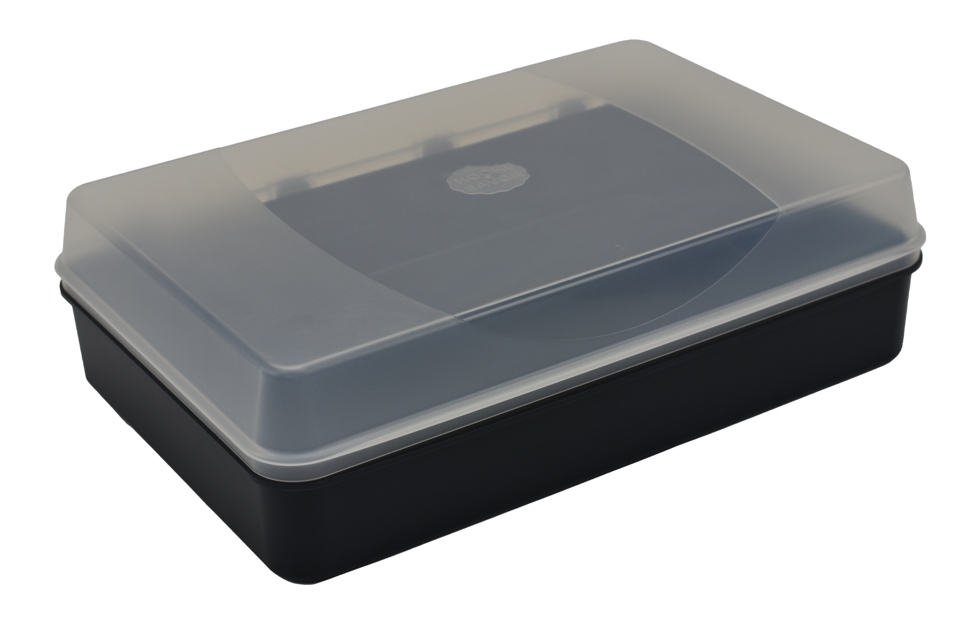 Kooki-Savor is a 13x9 food storage container with attached lid made of BPA-Free, food-grade materials. Raised lid is great for storing more of your favorite foods, kraft items, etc. Available in 3 color bases (Black, Blue and Rose)